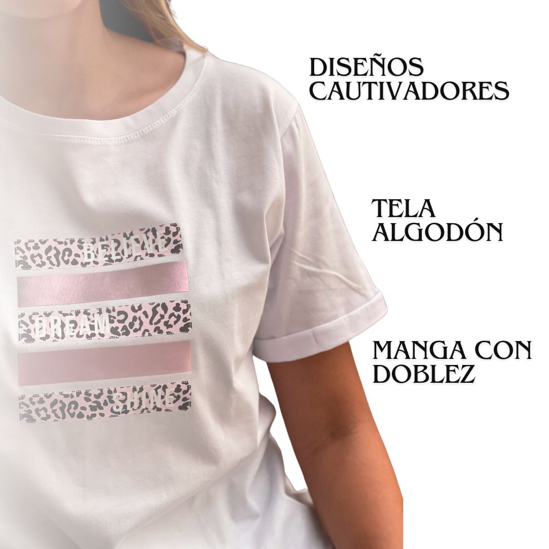 Descubre nuestra exclusiva colección de camisetas para mujer estampadas y eleva tu estilo con diseños únicos y modernos. Nuestras camisetas bonitas para mujer están confeccionadas con algodón de la más alta calidad, ofreciendo comodidad y durabilidad. Cada camiseta es perfecta para expresar tu personalidad y añadir un toque vibrante a tu closet. La suavidad de nuestras camisetas para mujer de algodón garantiza que te sientas fresca y cómoda todo el día. ¡Combínalas con nuestros chalecos y eleva tu look para cualquier ocasión!