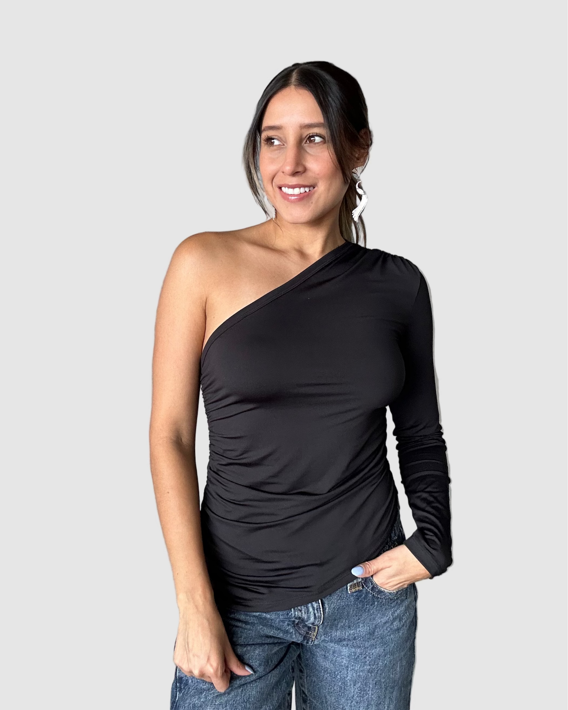 Este top asimétrico negro destaca por su diseño único de una sola manga larga, ofreciendo un estilo moderno y sofisticado. Su corte asimétrico aporta un toque de exclusividad que realza cualquier outfit, ideal para ocasiones que requieren elegancia con un detalle distintivo. La manga larga proporciona un balance perfecto entre cobertura y estilo, haciendo de esta prenda una elección versátil para combinar con diversos looks.